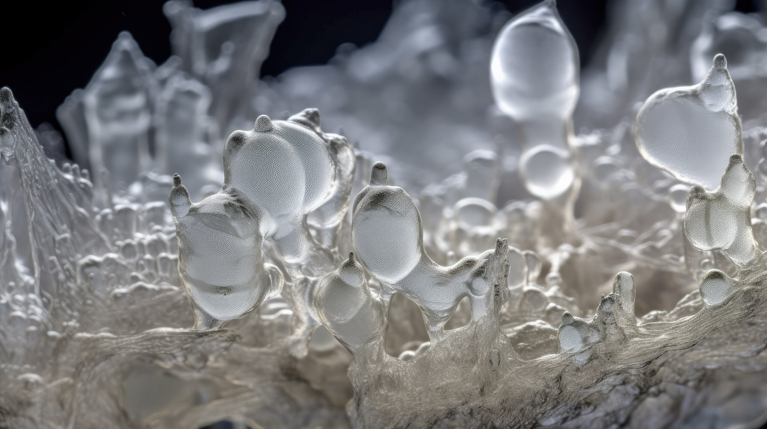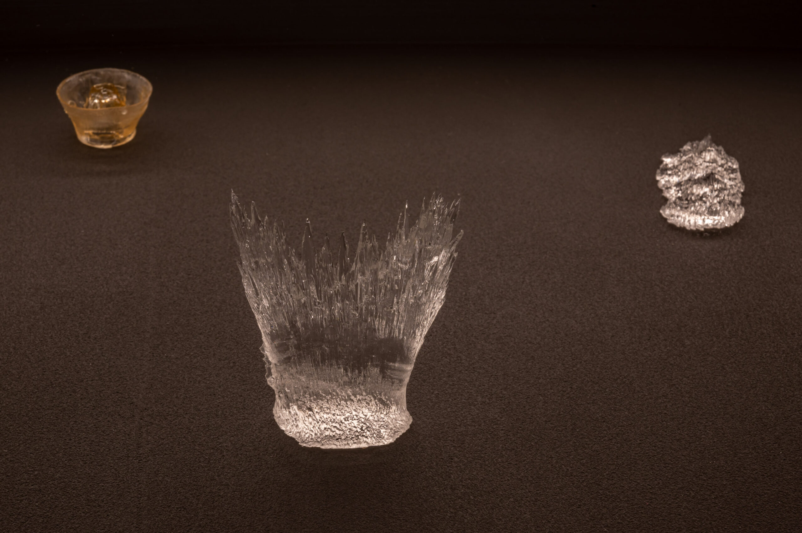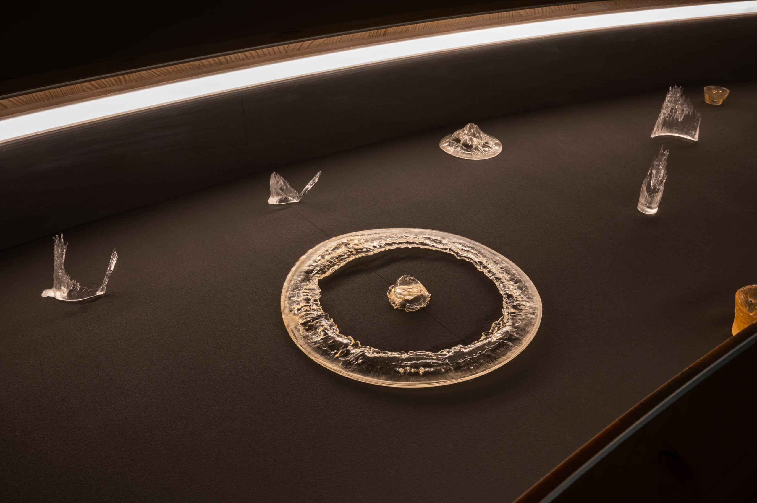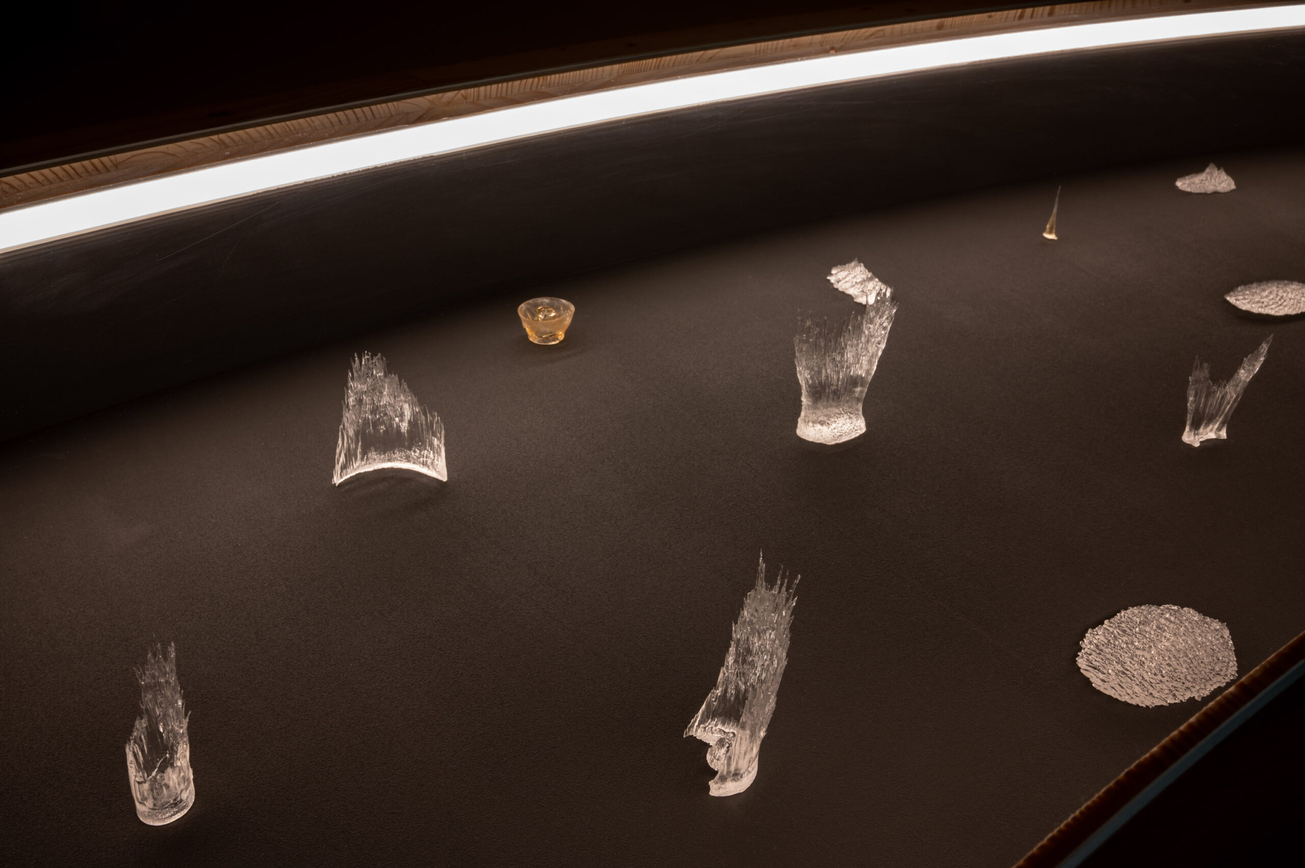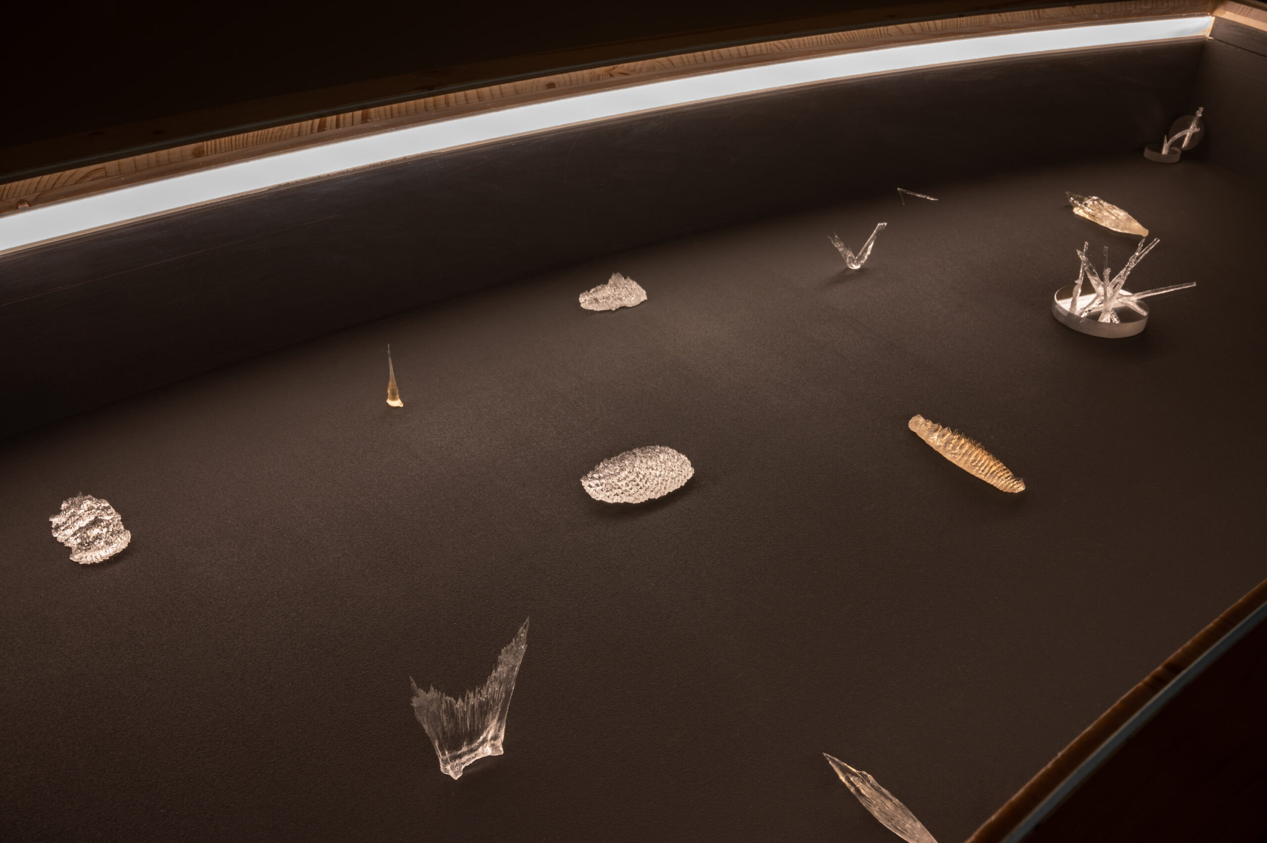 The installation “Light-Oriented Ontologies” takes a speculative and imaginative approach to explore this question. This research began during a residency at EPFL in Lausanne and reflects on the earliest roots of vision, sensing, and the conversion of light into energy and information. The installation comprises translucent objects of various sizes, presented in a custom curved vitrine, along with a video work. These objects are direct solidifications of light that has propagated through photosensitive resin. The crystallised light beams have resulted from interactions with different types of optical components and spatial movements generated by motors and manual manipulations. These objects constitute an open collection of shapes, which are ambiguously reminiscent of simple living organisms, organs of vision, fossils and organic-looking inorganic structures found in nature.
